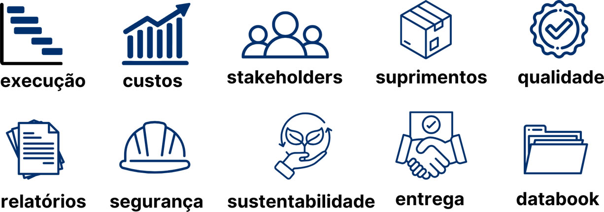 Acompanhamos cada detalhe, do planejamento à entrega final, garantindo eficiência, qualidade e previsibilidade em cada projeto através da gestão de:
